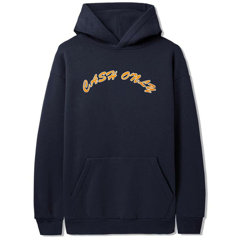 The Cash Only Felt Applique Logo Hoodie Deep Navy blends comfort with standout style: